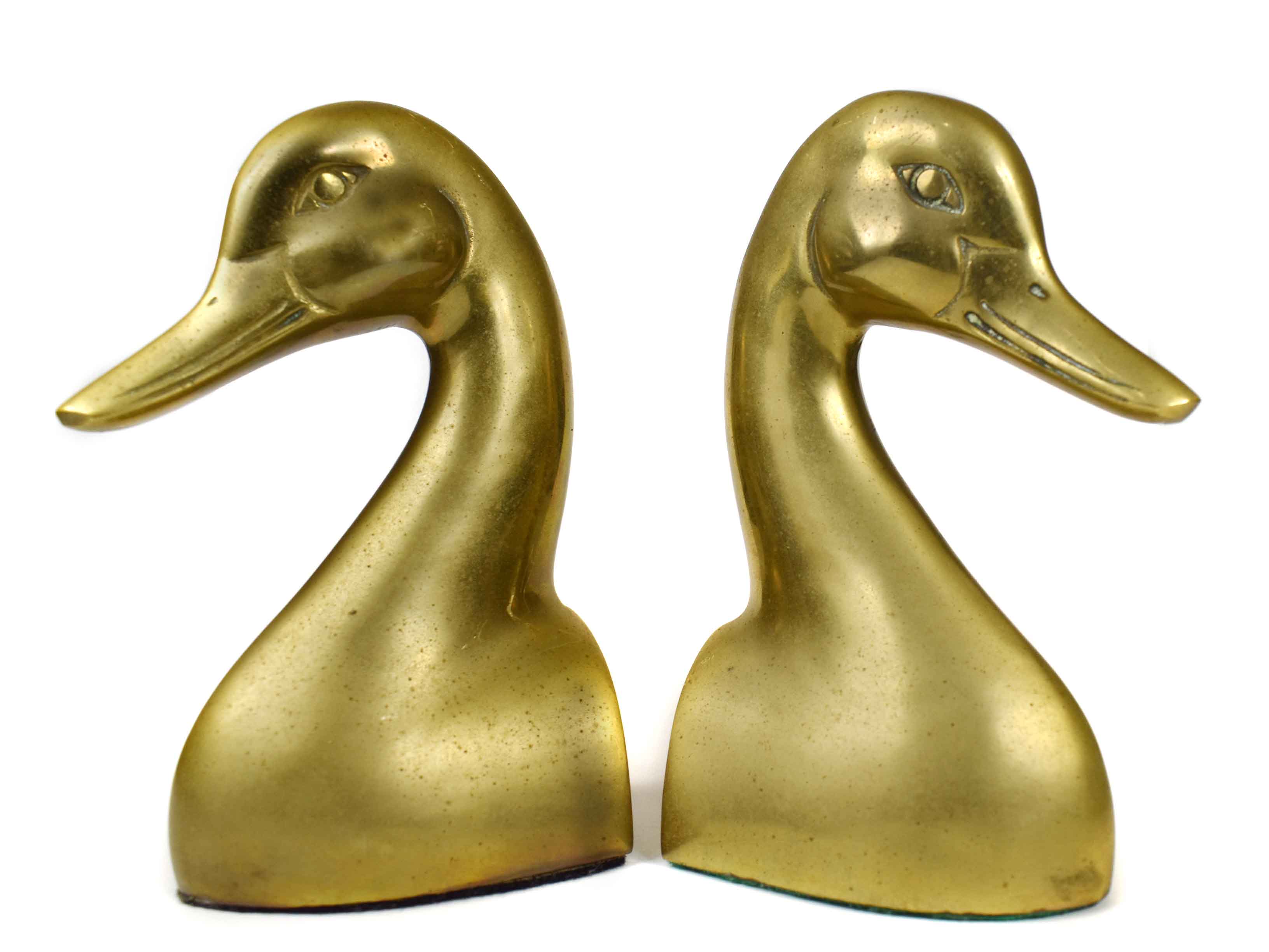 - A unique set of gold brass duck or mallard bird head bookends are the perfect set for displaying on a bookshelf or on a tabletop. They will bring a Hollywood Regency mid-century feel to your décor.